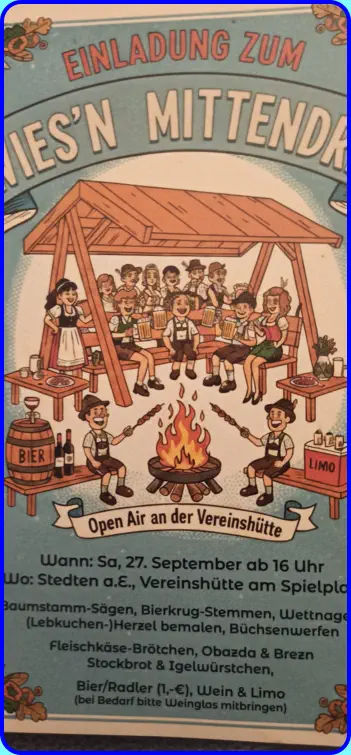 Planung & Durchführung Verein " Stedten Mittendrin" e.V. in 2025Weihnachtsbaum- Knistern am 18. Januar mit heißen Getränken und deftigen Leckereiengemeinsamer Frühjahrsputz am 5.April rund um den Spielplatz, Wartehalle, Kirche sowie um und auf dem Friedhofsgelände29.April Kräuterwanderung rund ums Dorf mit anschließender Verarbeitung sowie Verkostung in Moni' Schänke